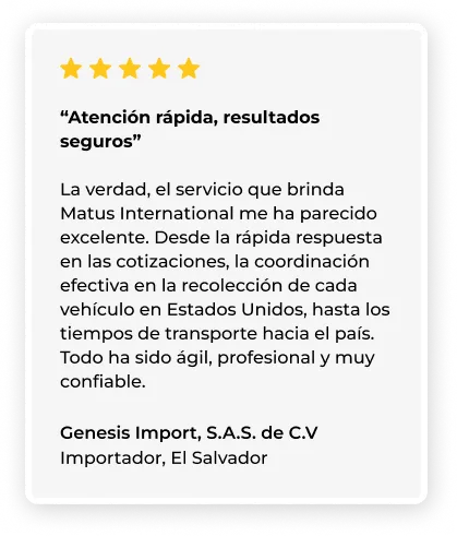 Matus International es un broker certificado de Copart con años de experiencia evaluando vehículos, asesorando compradores y coordinando exportaciones hacia Centroamérica y el Caribe. Hemos acompañado miles de compras en subastas, evitando errores comunes, optimizando costos y asegurando que cada unidad llegue correctamente a su destino.